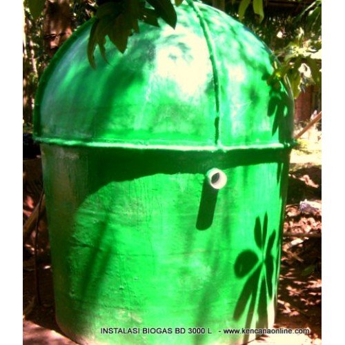 Material biomassa ( sampah organik, kotoran hewan, gulma air, gulma kebun dan tumbuhan hidup atau baru mati ) difermentasi dalam reaktor kedap udara, dengan bantuan bakteri pembangkit metanogenesis - yang terkandung dalam aktivator Green Phoskko GP 7- akan menghasilkan biogas ( CH4). Reaktor bagi proses kedap udara ( anaerobik atau tanpa oksigen) bentuk kubah (Fixed-dome), berkapasitas 3 m3 ini, kemudian disebut Digester Biogas BD 3000L. Reaktor harus kuat bagi tekanan gas yang dihasilkan pada 5 kg/cm2 serta toleran terhadap sifat kimia metana (CH4), CO2 (karbondioksida), sedikit sekali N2, H2, O2 dan H2S). Digester Biophos_KoGas BD 3000 L dibuat dari fiberglass bahan resin PL 07 LPE, jenis mat Wr 400 (mat anyam) dan mat Jushi -Kwe 300 (acak) 300 x 104, catalyst Butanox, mirror glase, pigmen HCA Dolphin Greenserta aerosil HDK ini memiliki ketebalan dinding 3 - 5 mm, mampu memfermentasi 150 liter per hari sejak siklus pertama penguraian pertama 10-27 hari. Kapasitas input material 3 m3 memiliki dimensi PLT (diameter 160 cm, tinggi 204 cm), akan bisa bertahan hingga diatas 10 tahun. Instalasi BD 3000 L menghasilkan biogas sebanyak 3 m3 tergantung pengkondisian lingkungan mikro ( suhu, PH, ukuran material, C/N rasio, homogenisasi). Volume biogas sebesar itu akan memiliki daya nyala ( energi pembakaran) dan kalori tinggi sebagai bahan kompor guna masak memasak setara dengan 1, 48 kg LPG Harga ini belum termasuk perlengkapan instalasi biogas antara lain gas holder, selang, pengukur tekanan (pressure gauge), klem (hose clamp), water trap, ball valve, dan pipe joiners berikut water trap.. CARA ORDER DAN PENGIRIMAN Pengiriman (delivery) antar kota, antar pulau dan luar negeri (ekspor), bagi kemudahan handling/ transportasi serta pemasangan (optional oleh teknisi kami) di tempat tujuan, disyaratkan minimal order ( inland darat) 5 unit/ truk CD (double ban), antar pulau minimal 16 unit per FCL ( Full Container Load) 20" atau 32 unit per FCL (Full Container Load) 40".