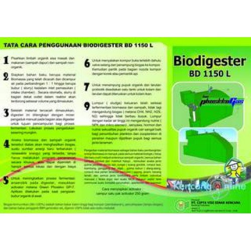 Biodigester Biogas BD 1150 L atau Portable Biogas Biodigester adalah pembangkit biogas bagi kegiatan masak memasak. Setiap hari, pada kondisi pemasukan material 20 kg/ hari, setelah dikecilkan ukuran oleh Pencacah Sampah Organik 1/4 Hp, menghasilkan 1 m3 biogas serta 40- 50 liter lumpur probiotik terdiri dari 5- 10 kg pupuk kompos padat dan cair