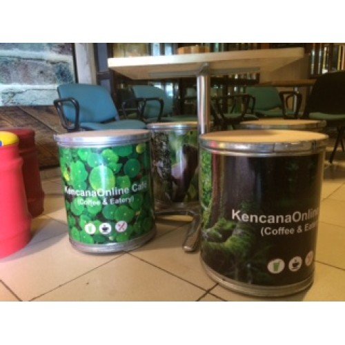 Kemasan telah diperkuat tiang dan alas kayu dari recycle palet untuk sekaligus dapat digunakan sebagai kursi pada coffee table set. Bagi pengiriman jarak jauh, tiap 8 vet tong/ drum di beri palet kayu pinus (upcycle product) yang telah di desain dapat digunakan menjadi 2 set meja. Dengan demikian, fungsi palet dan kemasan saat pengiriman 8 vet drum adalah 2 set Coffee Table gratis bagi para pelanggan.