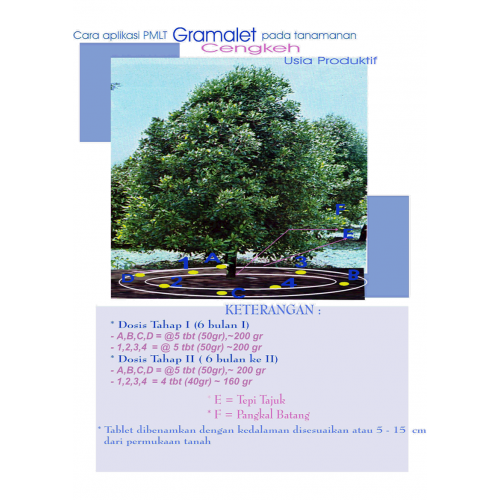 Pupuk majemuk lengkap tablet ( PMLT) Gramalet® Cengkeh memiliki komposisi NPK, MgSCa+ Mikro= 13-8-19-3-6-1+ 1 dengan dosis berpedoman pada tabel berikut :
