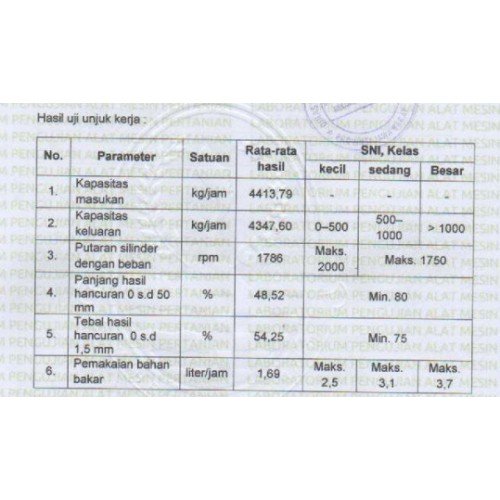 Dimensi Panjang -Lebar- Tinggi ( 1850 mm x 1000 mm x 1500 mm), dimensi pisau ( 200 mm x 65 mm x 4 mm), jumlah pisau 24, jumlah pelempar 3 buah, jarak antar pisau 30 mm, kekerasan pisau HRC , diameter dudukan pisau 4 Inchi,