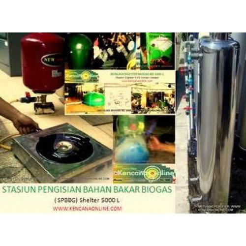 Instalasi Biogas shelter BD 3-5000 L terdiri dari 3 unit digester 5000 liter, 1 mesin pencacah sampah MPO 500 HD (Elektrik), 2 unit pemurnian biogas MP 24150 (stainless steel), gas holder kapasitas 10 m3, 1 unit generator BG 2500 w (genset biogas daya 2500 watt), bakteri aktivator metan GP-7 untuk 1 bulan serta perlengkapan instalasi hingga unit kompor dan generator. Instalasi ini berkemampuan mengolah limbah biomassa atau sampah organik untuk pertama kalinya 15 m3 (setara dengan berat 5 ton) dan hari selanjutnya 3 m3 atau 0,9 ton/ hari. Setiap harinya, output shelter Instalasi BD 5000 L menghasilkan biogas dengan kemurnian > 80 % metan (CH4) sebanyak 27 m3 yang memiliki daya nyala dan kalori tinggi sebagai bahan kompor guna masak memasak setara dengan 12,42 kg LPG. Untuk kepentingan perluasan penggunaan biogas, dengan kompresor membran (Oilles) dialirkan kedalam kompor tabung bertekanan. Agar biogas sebagai energi baru terbarukan dapat dimanfaatkan oleh masyarakat lebih luas lagi, biomethan atau biogas setelah dimurnikan tersebut dikemas dalam kompor tabung bertekanan BizGas 20101 sehingga lebih ringkas, dapat dijual di pengecer serta dibawa ke rumah masyarakat seperti halnya LPG. Untuk kepentingan itu, Instalasi Shelter BD 3-5000 L dapat dijadikan suatu Stasiun Pengisian Bahan Bakar Biogas (SPBBG). |